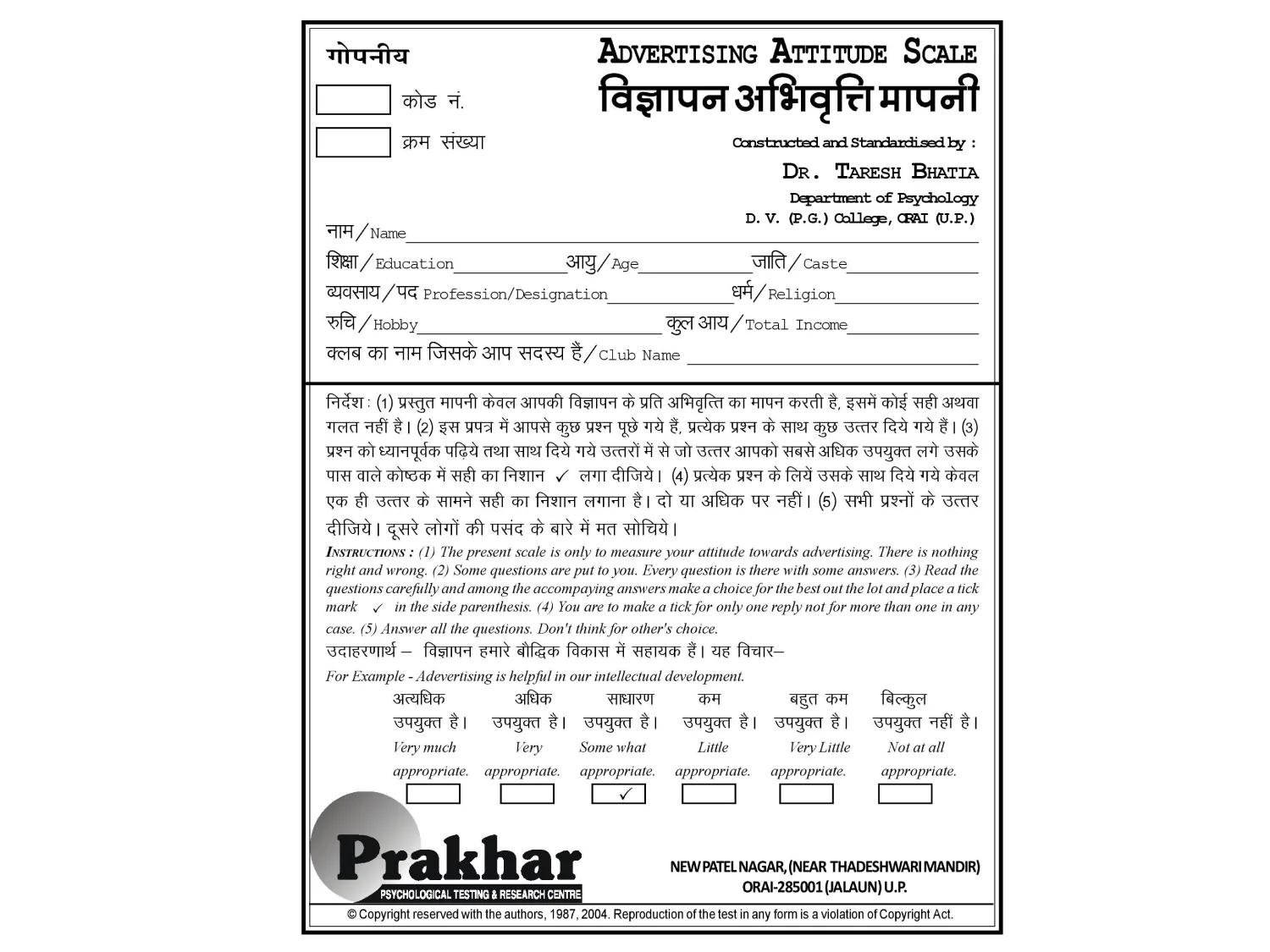 The Advertising Attitude Scale is a carefully designed instrument aimed at measuring attitudes toward advertising in individuals aged 20-45. This scale assesses how consumers feel, think, and respond to advertising in general, capturing both their conscious and unconscious perceptions. By analyzing attitudes across cognitive, affective, and behavioral dimensions, the scale provides insights into the complex ways that consumers engage with advertisements. Objectives of the Advertising Attitude Scale: 1. Primary Objective: To assess individuals' attitudes toward advertising in general, providing a snapshot of how they perceive advertising's role and impact. 2. Secondary Objectives: • To explore the specific components of consumer attitudes, such as thoughts, feelings, and behavioral tendencies toward advertisements. • To support marketers in understanding consumer preferences and designing effective ad strategies that resonate with target audiences. Key Components Measured: The scale evaluates attitudes across three primary dimensions integral to advertising attitudes: 1. Cognitive Dimension: This dimension assesses consumers' beliefs and perceptions about advertising. It includes how consumers understand the purpose, credibility, and value of advertisements. For example, cognitive items may explore whether consumers find ads informative, trustworthy, or helpful for making purchase decisions. 2. Affective Dimension: This part focuses on the emotions and feelings that advertisements evoke in consumers. Positive feelings might include enjoyment, entertainment, or inspiration, while negative feelings could encompass annoyance or skepticism. The affective responses to advertising are crucial, as emotional engagement often drives consumer attention and receptiveness. 3. Behavioral Dimension: This dimension examines the actions consumers are likely to take in response to advertisements. It includes behavioral intentions, such as the likelihood of making a purchase, sharing the advertisement, or researching the product further. Positive behavioral responses indicate that consumers are more inclined to engage with ads in ways that benefit advertisers. Structure and Format: • Scale Composition: The scale consists of 30 items designed to capture diverse aspects of advertising attitudes. Each item addresses one or more of the cognitive, affective, and behavioral dimensions. • Response Format: Participants respond to each item on a six-point rating scale ranging from strong agreement to strong disagreement, allowing for nuanced expression of attitudes. The scale is bilingual (Hindi & English), making it accessible to a broad range of users in India. • Scoring: Scores are calculated for each dimension as well as for the overall attitude toward advertising. Higher scores reflect a more favorable or positive attitude, while lower scores indicate a more critical or negative view of advertising. Interpretation of Scores: • High Score: A high score suggests a positive attitude toward advertising. Individuals with high scores tend to view advertisements as beneficial, credible, or entertaining. They may also exhibit a greater openness to advertisements and be more likely to consider advertised products. • Moderate Score: A moderate score indicates a balanced view, where consumers may see both positives and negatives in advertising. These individuals may appreciate certain aspects, like informativeness, but may also experience some negative reactions, such as skepticism. • Low Score: A low score reflects a negative attitude, where individuals may view advertising as intrusive, manipulative, or untrustworthy. These individuals are more likely to ignore or avoid ads, feeling that they add little value to their decision-making process. Analysis and Application: 1. Consumer Insights: By analyzing individual scores across the three dimensions, marketers can better understand specific consumer needs and preferences. For instance, if affective scores are low, consumers might find current ads unengaging or even irritating, suggesting a need for more creative or visually appealing content. 2. Ad Strategy Development: The scale's results can guide advertisers in designing ad campaigns that resonate with target audiences. A high cognitive score, for example, indicates that consumers value information-rich ads, while high affective scores might signal a preference for ads that are visually appealing or humorous. 3. Comparative Analysis: Scores can be used for comparative analysis across different demographics, such as age, gender, or education level. Such comparisons can reveal specific trends, such as younger consumers having higher affective scores due to their preference for interactive and visually stimulating content. 4. Feedback Loop: Over time, advertisers can use the scale results to assess the impact of their ad strategies and adjust campaigns accordingly. If scores change after an ad campaign, it may reflect shifts in consumer attitudes or engagement due to the ad's effectiveness. Expected Outcomes and Implications: The Advertising Attitude Scale has several practical applications for both marketers and researchers: • Enhanced Targeting: By understanding consumer attitudes, marketers can target their messages more effectively, focusing on groups with favorable attitudes or working to address concerns of those with negative views. • Improved Consumer Engagement: High scores across the affective and behavioral dimensions, for instance, signal an opportunity to engage consumers through emotionally appealing ads that also encourage action. • Insightful Consumer Research: The scale serves as a tool for studying consumer psychology, aiding in the broader understanding of how people interact with and respond to advertising. Thus Advertising Attitude Scale provides a nuanced, multidimensional assessment of attitudes toward advertising, encompassing cognitive, affective, and behavioral responses. T