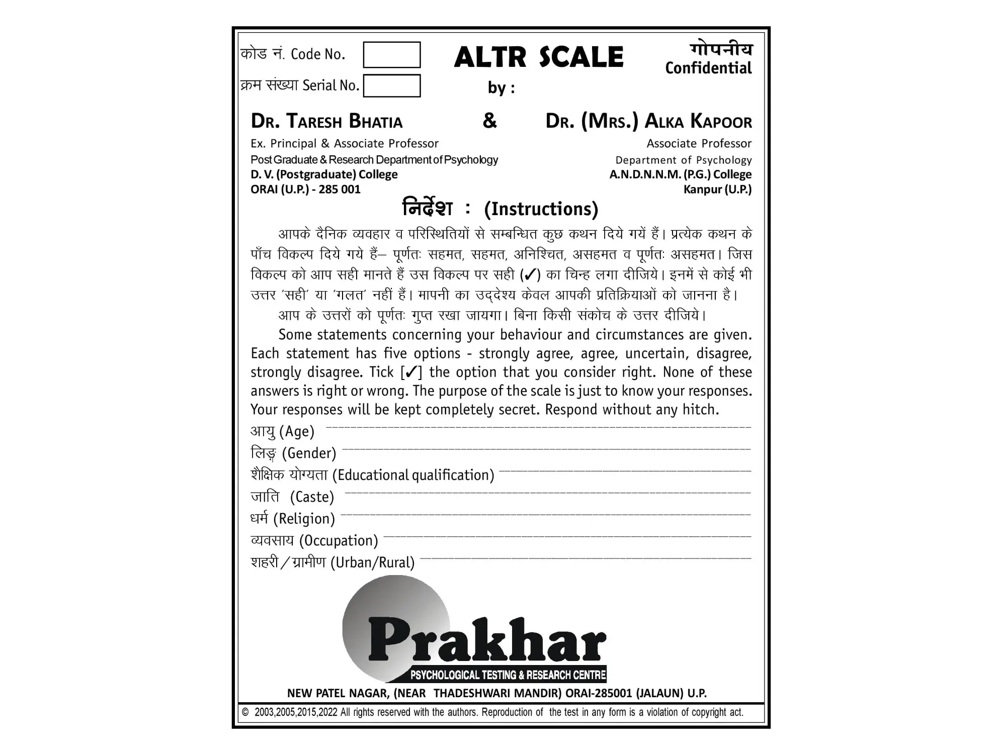 The Altruism Scale is a psychometric tool developed to measure an individual's propensity for altruistic behavior, specifically focusing on the 15-20 age group. This scale evaluates the tendency of individuals to engage in selfless acts that benefit others, without expecting any external rewards in return. It consists of 40 items and is designed as a Likert-type rating scale, allowing respondents to indicate the extent to which they agree or disagree with statements regarding their altruistic tendencies. Key Features of the Altruism Scale: • Age Group: Specifically targets individuals aged 15-20 years, an important developmental period where social behaviors and personality traits, such as altruism, are being shaped. • Response Format: The scale uses a Likert-type rating system, which is a common method for measuring attitudes and behaviors. Participants rate each statement based on a scale (such as from "strongly disagree" to "strongly agree"). • Bilingual: The scale is available in both Hindi and English, making it more accessible to a diverse population, particularly in regions where these languages are widely spoken. • High Reliability and Validity: The scale has been developed with attention to reliability (consistency in measurement) and validity (accuracy in measuring the construct of altruism). Dimensions of Altruistic Behavior: Altruism involves a variety of actions and motivations, including: 1. Helping Others Without Expectation of Return: Altruistic behavior is characterized by the willingness to assist others without expecting personal gain or reward. 2. Empathy: An altruistic individual often feels empathy towards others and is motivated by the desire to reduce the suffering or improve the well-being of others. 3. Volunteering: Altruism is reflected in activities where individuals offer their time and effort for the betterment of others, such as community service or peer support. Benefits of Altruistic Behavior: • Improved School Achievement: Research suggests that altruism can positively impact academic success. Altruistic students may have better peer relationships and be more engaged in school activities, which can translate into improved academic performance. • Reduction in School Dropouts: Students who engage in altruistic behavior are more likely to feel connected to their school environment and less likely to drop out. Altruistic behaviors foster a sense of belonging and purpose within educational institutions. • Decrease in Physical Violence and Bullying: Altruistic tendencies can help reduce aggressive behaviors such as bullying and physical violence. Students who are compassionate and willing to help others are less likely to engage in or tolerate such harmful actions. • Mental Health Benefits: Altruism is closely linked to mental well-being. Engaging in selfless acts can lead to positive emotions, enhance social bonds, and reduce feelings of loneliness or isolation. As a result, altruistic students are less likely to experience mental health problems such as depression or anxiety. How Altruism Influences Adolescents: During adolescence, social behaviors and values are deeply influenced by peer interactions, family dynamics, and educational environments. The Altruism Scale helps to identify students who are inclined towards prosocial behaviors, providing insights into their personality and social attitudes. • Prosocial Identity: Altruistic adolescents often develop a prosocial identity, where they see themselves as responsible members of their community, capable of making a difference in others' lives. • Positive Peer Influence: Altruistic behavior encourages positive peer influence, fostering an environment of cooperation, kindness, and mutual respect. This can lead to better social relationships and a more inclusive school environment. • Social and Emotional Learning (SEL): Encouraging altruism in schools aligns with social and emotional learning programs that emphasize empathy, compassion, and responsible decision-making. Applications: The Altruism Scale can be used in a variety of settings, including: • Educational Settings: Schools can use the scale to identify students who exhibit strong altruistic tendencies, which can be nurtured through school programs or community service opportunities. It can also be used to assess the overall social climate of a school. • Counseling and Interventions: The scale can help counselors identify students who may benefit from programs aimed at reducing aggressive behaviors or addressing mental health concerns. It is especially useful in developing interventions that focus on peer support and prosocial behavior. • Research: The scale serves as a valuable tool for researchers studying adolescent development, prosocial behavior, and the factors that influence altruism during this critical period of life. Thus the Altruism Scale provides a comprehensive assessment of altruistic tendencies in adolescents, and its findings can be used to enrich students' academic experiences, foster positive social behaviors, and enhance their overall mental health and well-being. By understanding and promoting altruism, schools and communities can create supportive environments that encourage prosocial behavior, reduce conflict, and improve student outcomes.