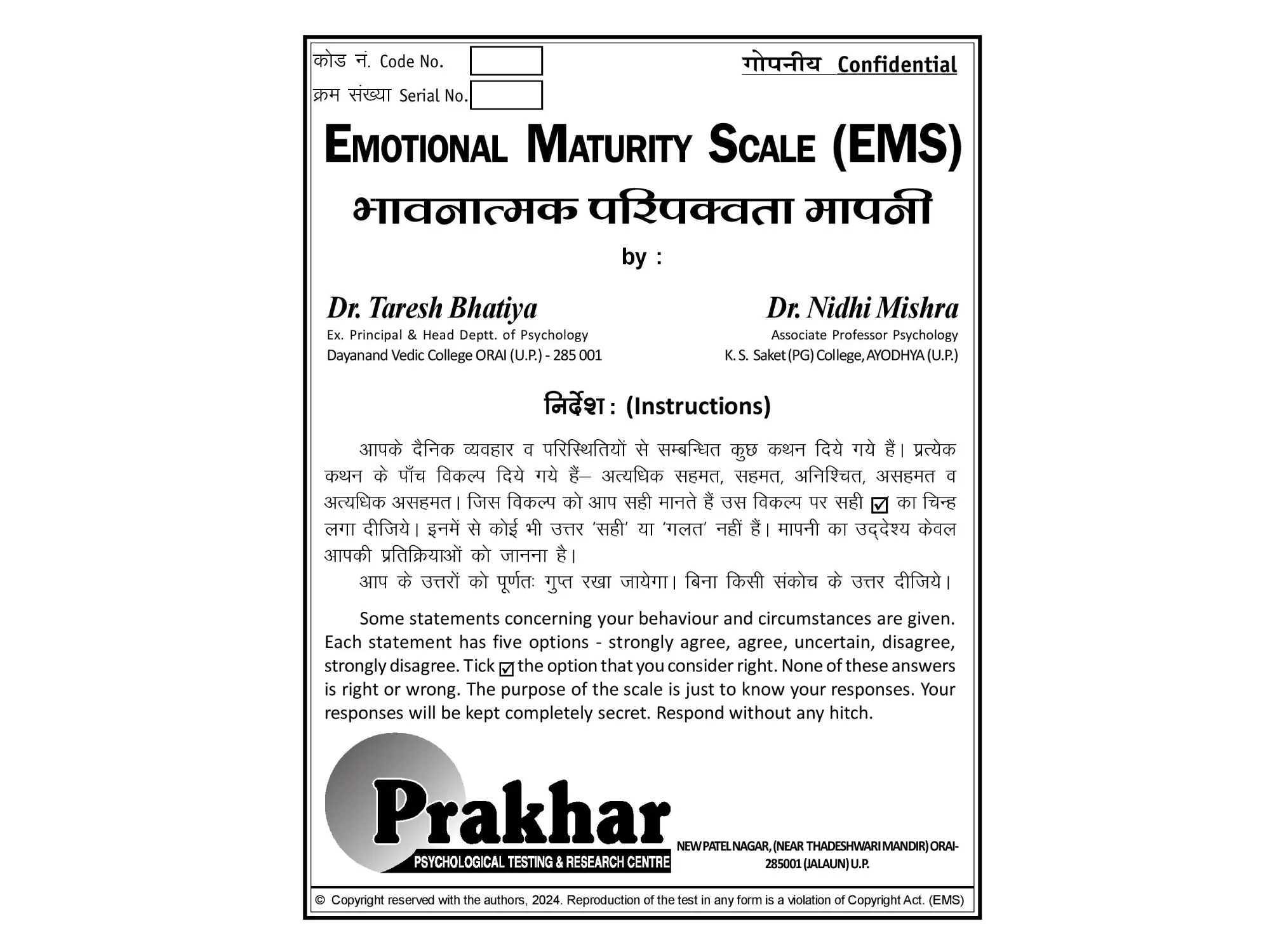 The Emotional Maturity Scale (EMS) is a comprehensive psychometric tool designed to assess an individual's emotional maturity across seven essential dimensions. Developed by Taresh Bhatia & Nidhi Mishra, this scale provides a detailed evaluation of emotional development and maturity in individuals aged 16 to 65 years. The scale is available in both Hindi and English (Bilingual), ensuring accessibility for diverse populations, and demonstrates high reliability and validity. Seven Key Areas Measured by the Emotional Maturity Scale: 1. Self-Awareness: This dimension assesses an individual's ability to recognize and understand their own emotions, thoughts, and behaviors. Self-awareness is fundamental to emotional maturity, as it enables individuals to identify their emotional states, triggers, and patterns. High scores in this area indicate a strong capacity for introspection and self-reflection, which are crucial for personal growth and emotional regulation. 2. Emotional Regulation: This area measures the ability to manage and control emotional responses effectively, especially in challenging or stressful situations. Emotional regulation involves the capacity to modulate emotions, maintain emotional balance, and respond appropriately rather than react impulsively. Individuals with high scores demonstrate resilience and the ability to navigate emotional challenges with composure. 3. Motivation: This dimension evaluates intrinsic motivation, goal-setting, and the drive to achieve personal and professional objectives. Emotional maturity includes the ability to maintain motivation despite setbacks and to channel emotions productively toward achieving goals. High scores reflect self-motivation, perseverance, and a positive approach to challenges. 4. Empathy & Social Skills: This area assesses the capacity to understand and share the feelings of others, as well as the ability to interact effectively in social situations. Empathy involves recognizing and responding to others' emotional states, while social skills encompass communication, relationship-building, and conflict resolution. High scores indicate strong interpersonal abilities and emotional intelligence in social contexts. 5. Personal Responsibilities: This dimension measures the ability to take ownership of one's actions, decisions, and their consequences. Emotional maturity includes accepting responsibility for personal choices, learning from mistakes, and being accountable. High scores reflect a mature approach to personal accountability and the ability to handle responsibilities effectively. 6. Adaptability & Flexibility: This area evaluates the capacity to adjust to changing circumstances, cope with uncertainty, and remain flexible in the face of challenges. Adaptability is a key component of emotional maturity, as it enables individuals to navigate life's transitions and unexpected situations with resilience. High scores indicate the ability to adapt to new environments, situations, and demands without excessive stress. 7. Sense of Humor: This dimension assesses the ability to maintain perspective, find lightness in difficult situations, and use humor as a coping mechanism. A healthy sense of humor is associated with emotional maturity, as it reflects the ability to maintain balance, reduce stress, and approach challenges with a positive outlook. High scores indicate the capacity to use humor appropriately and maintain emotional well-being. Scoring and Interpretation: The Emotional Maturity Scale provides a comprehensive profile of an individual's emotional development across all seven dimensions. Scores are calculated for each area as well as for overall emotional maturity. • High Scores: High scores across dimensions indicate well-developed emotional maturity, suggesting that the individual has strong emotional intelligence, self-awareness, and the ability to navigate life's challenges effectively. • Moderate Scores: Moderate scores may indicate areas where further development is possible, highlighting opportunities for growth in specific emotional maturity dimensions. • Low Scores: Lower scores in specific areas may suggest areas where the individual could benefit from support, counseling, or targeted interventions to enhance emotional maturity. Practical Applications: The Emotional Maturity Scale is valuable for: 1. Personal Development: Individuals can use this scale to gain insights into their emotional maturity, identifying strengths and areas for growth. 2. Counseling and Therapy: Mental health professionals can utilize this scale to assess emotional development and design targeted interventions for clients. 3. Educational Settings: Educators and counselors can use this scale to support students' emotional development and identify those who may benefit from additional support. 4. Workplace and Organizational Development: Employers can use this scale to assess emotional maturity in employees, supporting professional development and team dynamics. 5. Research: Researchers can utilize this scale to study emotional maturity across different demographics, age groups, and contexts. Counseling Implications: When low or moderate scores are identified in specific areas, counseling or support may be recommended to enhance emotional maturity. Interventions may include: • Emotional Intelligence Training: To improve self-awareness and emotional regulation. • Social Skills Development: To enhance empathy and interpersonal abilities. • Stress Management and Coping Strategies: To improve adaptability and resilience. • Personal Growth Programs: To support overall emotional development and maturity. The Emotional Maturity Scale (EMS) thus serves as a comprehensive tool for assessing emotional development, providing valuable insights that can guide personal growth, counseling interventions, and support systems to enhance overall emotional well-being and maturity.